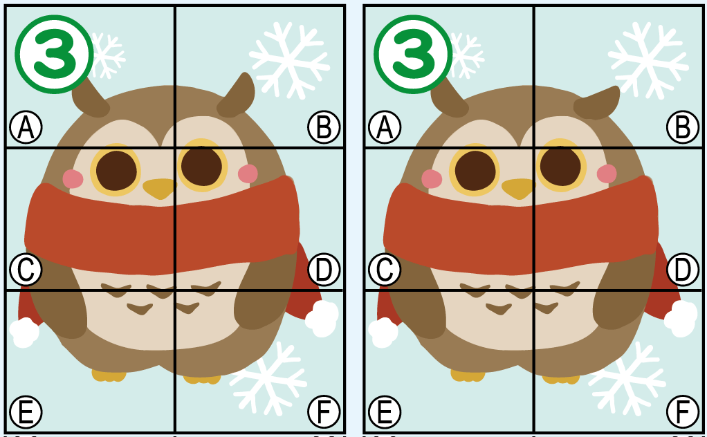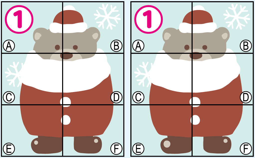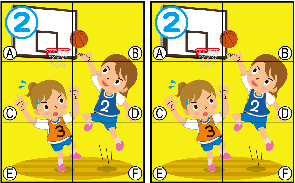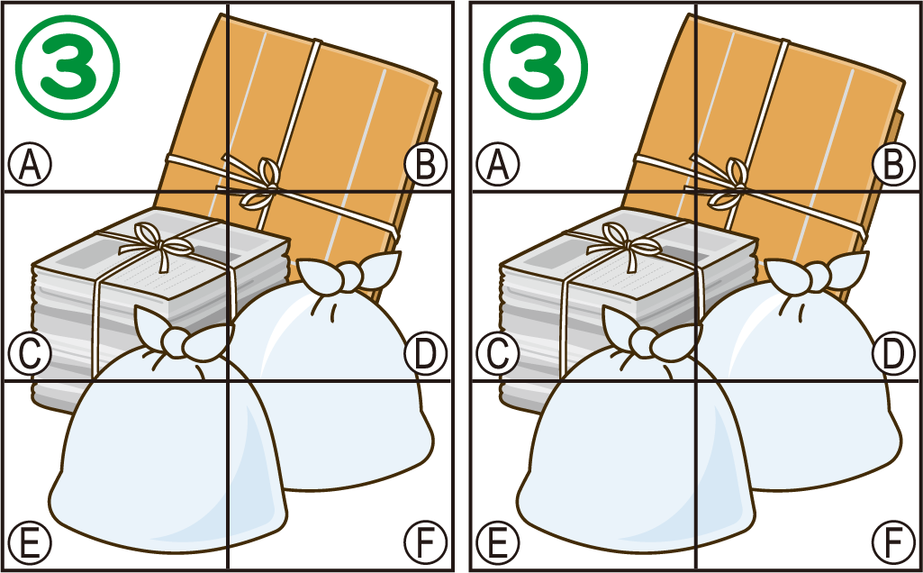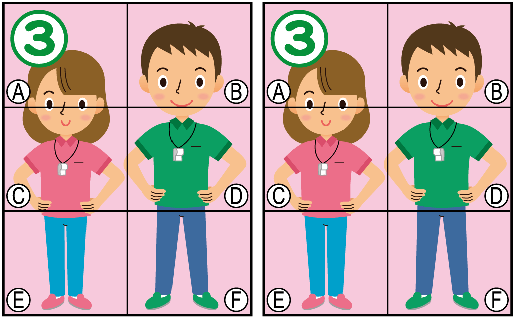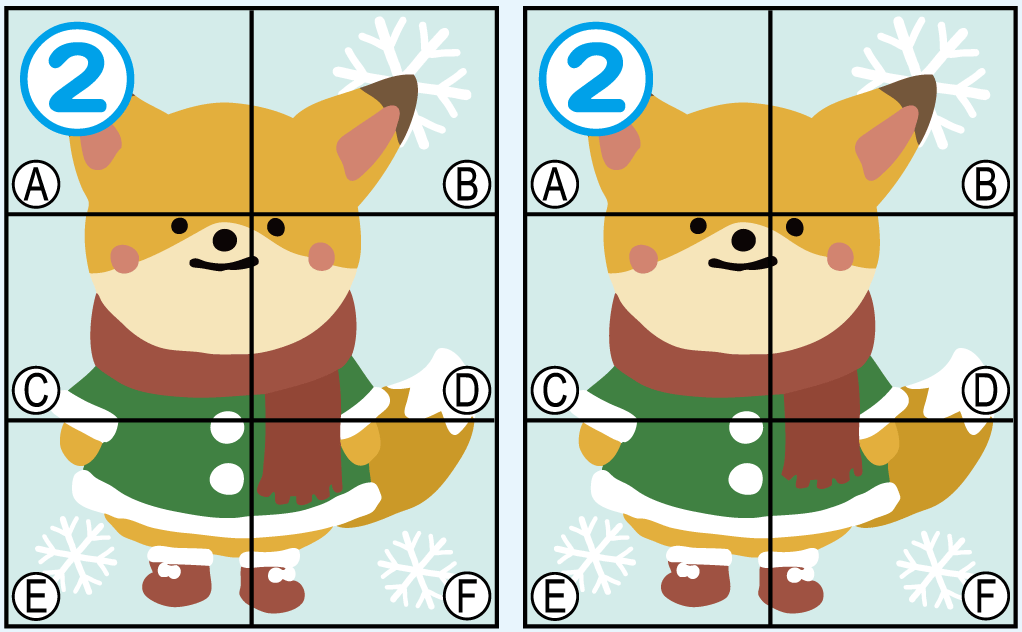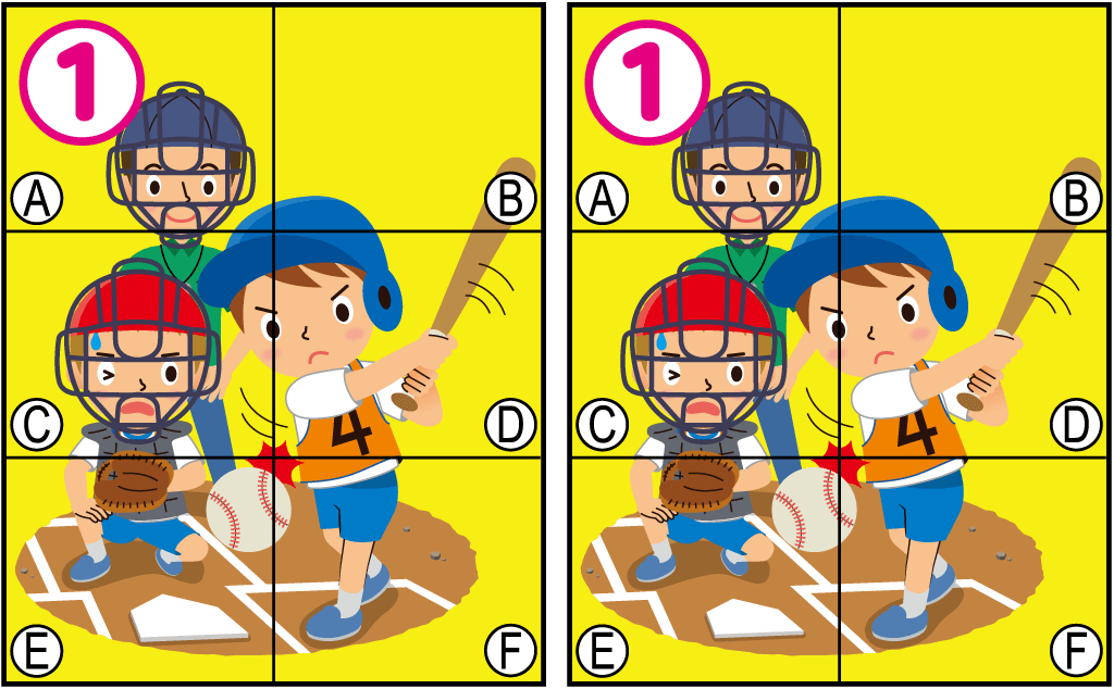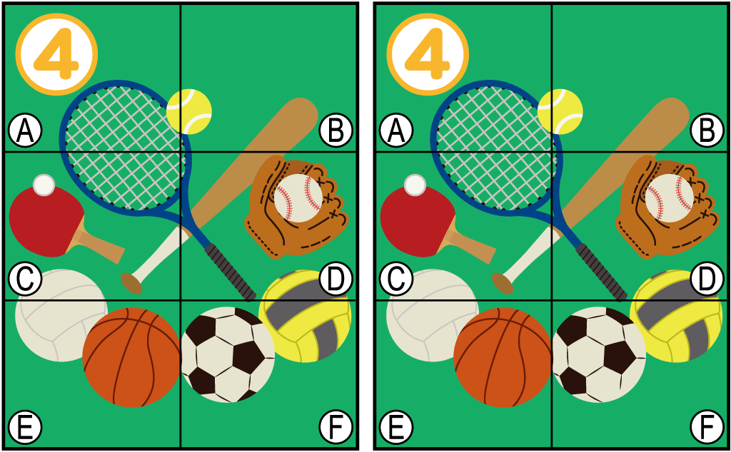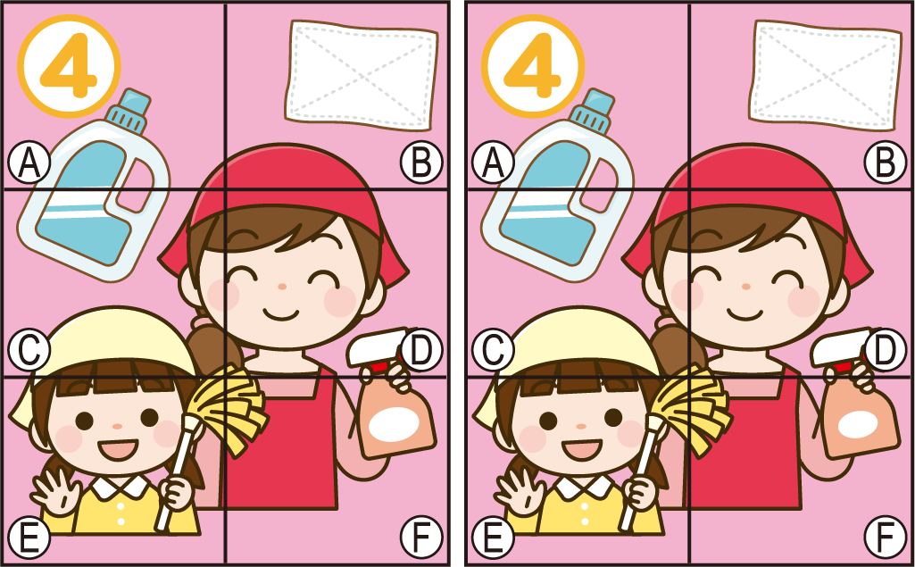問題下記4つの絵の右と左で違う箇所が1箇所あります。